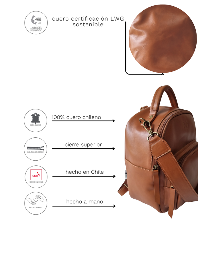 Hecho a Mano con Cuero Natural Auténtico: Proveniente del sur de Chile, cada mochila es meticulosamente elaborada con cuero natural de alta calidad, garantizando durabilidad y un acabado elegante. El uso de este noble material resalta la esencia de lo artesanal.