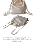 - Bolsa Algodón : Incluye bolsa ecológica tipo mochila de algodón de 6 onzas (170gr/m2), tamaño para productos medianos. 100% biodegradable. Doble cordón de algodón crudo de 65 cm de largo y 2.5 cm de ancho.