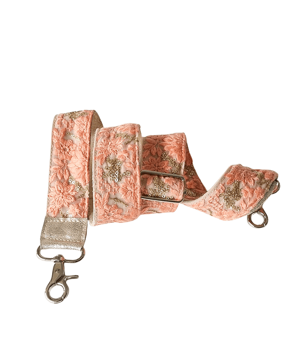 Strap Ajsutable Largo Cuero Dorado Flores Fucsia